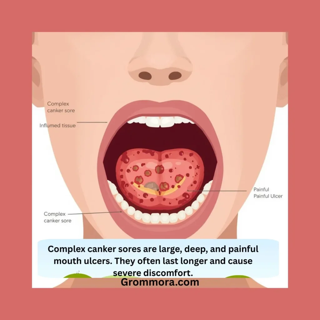 Complex canker sores are a more severe form of mouth ulcers that differ from the common, simple canker sore. While typical canker sores are small, shallow, and heal within 1–2 weeks, complex canker sores are larger, deeper, and often more painful. They may recur frequently and take longer to heal, sometimes lasting several weeks. These sores can cause difficulty eating, drinking, or speaking, and are often linked to underlying health conditions, such as immune system disorders, vitamin deficiencies, or gastrointestinal problems. Unlike simple canker sores, complex sores may require medical attention, prescription medications, or topical treatments to reduce pain and promote healing. Understanding the severity helps patients seek timely care and avoid complications.